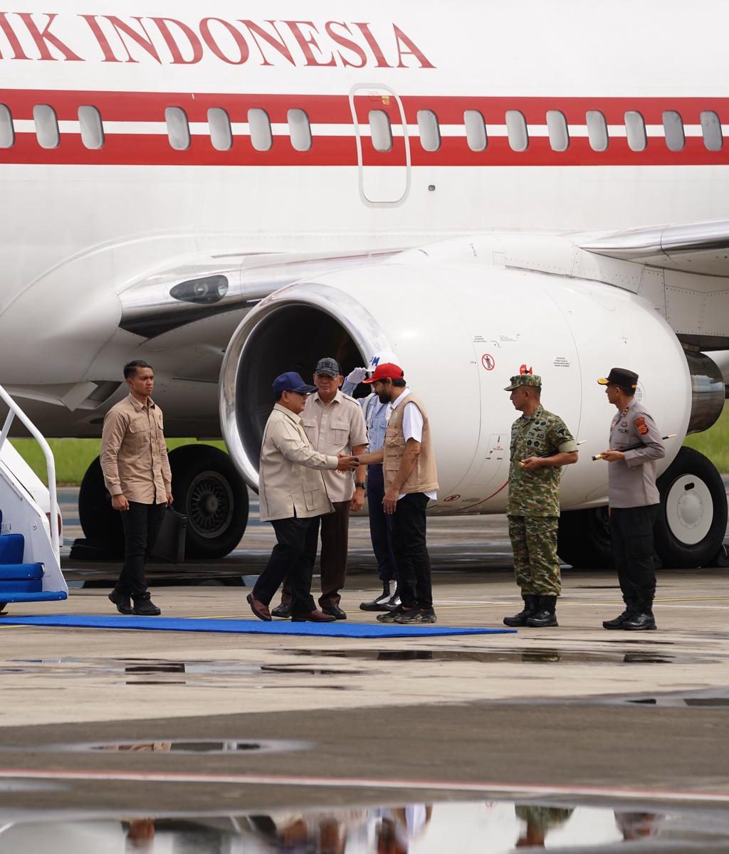 Aceh Besar – Gubernur Aceh H. Muzakir Manaf, bersama Pangdam Iskandar Muda, Kapolda Aceh, menjemput kedatangan Presiden Republik Indonesia, Probowo Subianto di Bandara Sultan Iskandar Muda Aceh Besar, Minggu 7/12. Gubernur dan presiden kemudian berangkat dengan helikopter meninjau lokasi terdampak bencana Hidrometeorologi Aceh, yaitu di Kabupaten Bireuen.